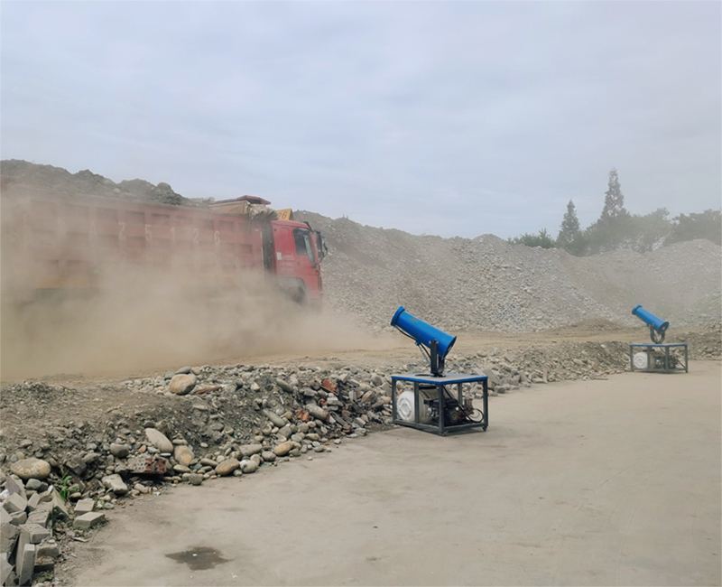 来到厂区后方,货车正在转运沙石,依次交替,车辆轰鸣,扬起漫天粉土。喷雾机没有开启,形同虚设,现场没做任何防尘处理措施。